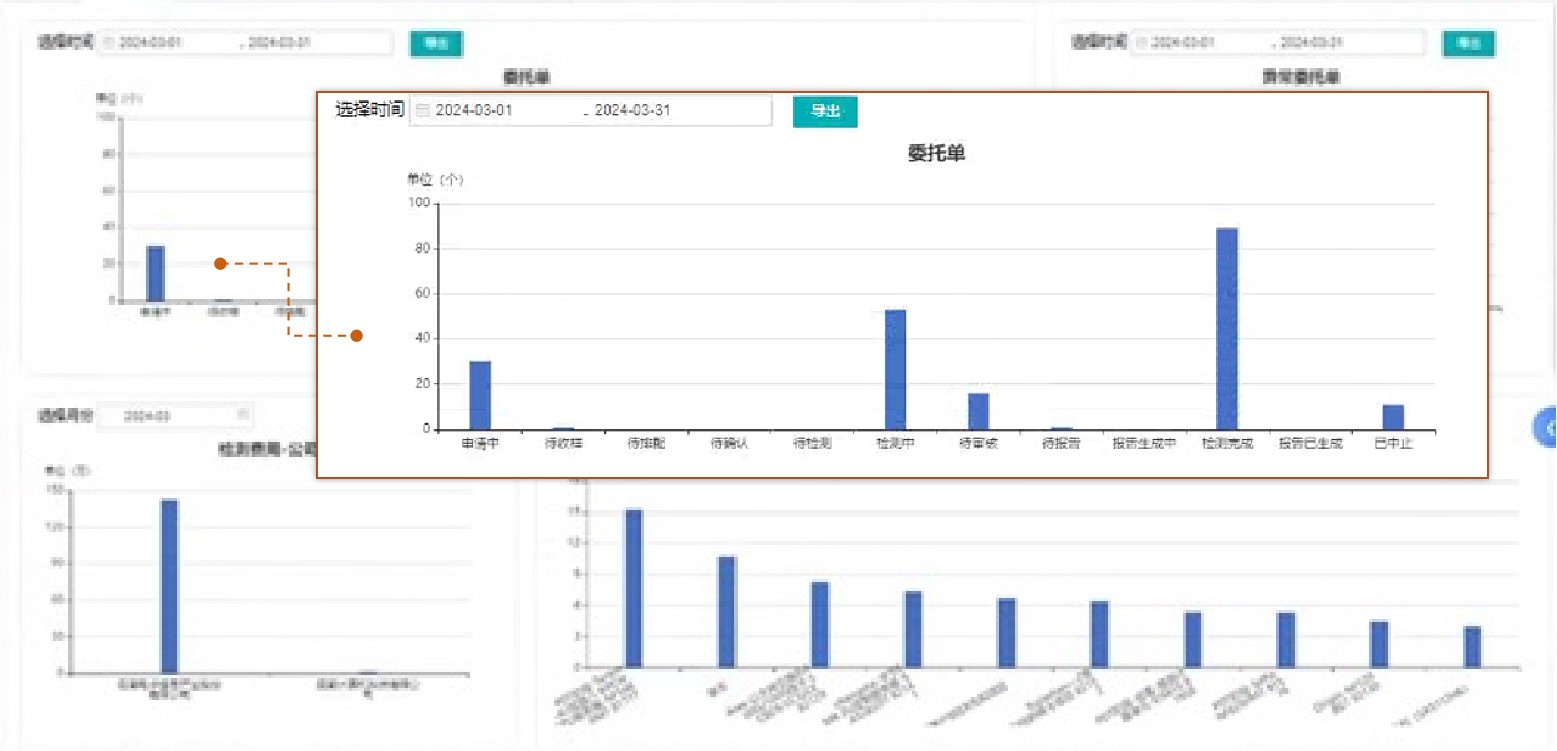 以工作量統計為例,金現代LIMS可實現按檢測任務分類、樣品類別、檢測項目、檢測部門、檢測人員、產品客戶等多種條件、多種方式統計一段時間內的工作量、檢測數據量信息,對人員工作量統計可以按照部門、班組、個人進行統計,所有的統計都可以導出到 Excel 中。