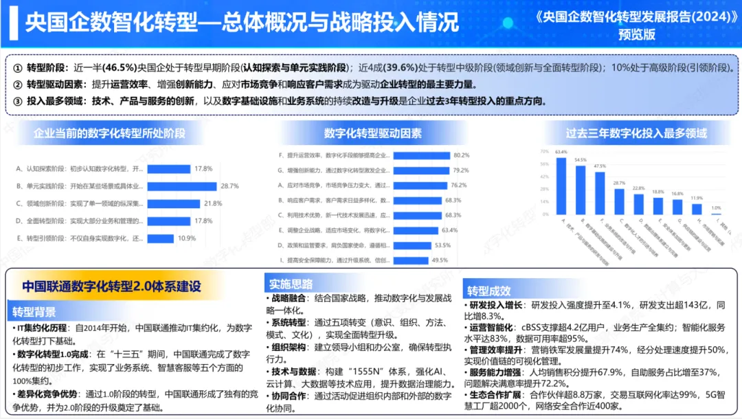 報告指出,從轉型階段來看,近一半央國企處于早期階段,占比為46.5%,以認知探索和單元實踐為主;近四成已進展至中級階段,占比39.6%;而高級階段,即引領階段的企業僅占10%。驅動轉型的主要因素包括提升運營效率、增強創新能力、應對市場競爭和響應客戶需求。技術、產品與服務的創新,以及數字基礎設施和業務系統的持續改造與升級,是企業過去3年轉型投入的重點方向。