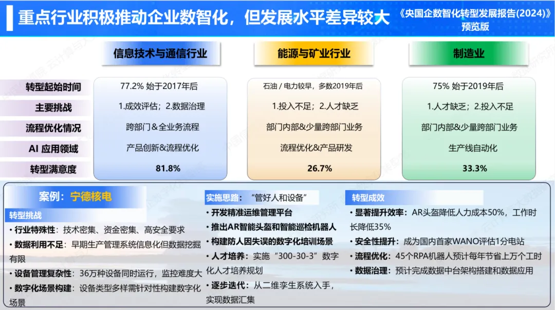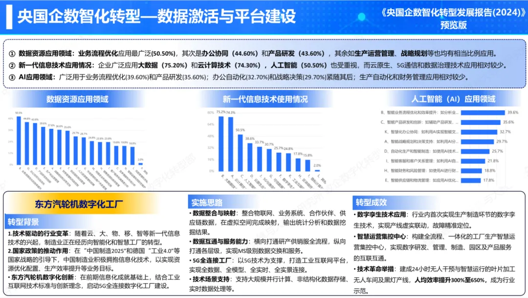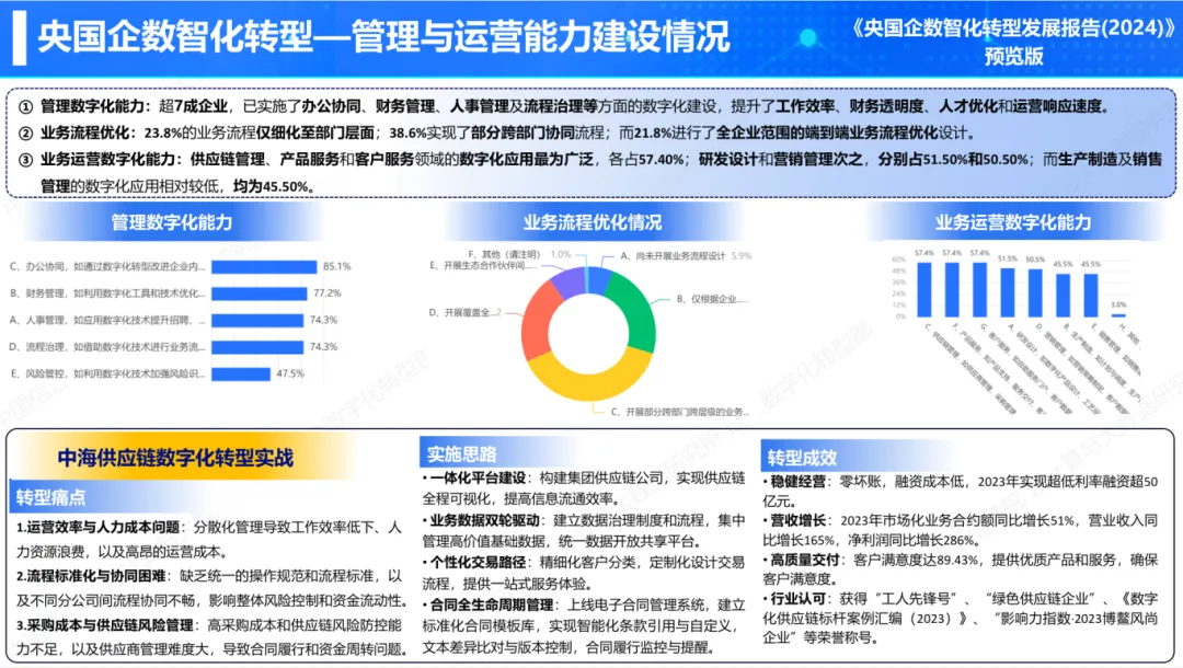日前,由中國信通院攜手金現代、中國移動、騰訊研究院等單位編制的《央國企數智化轉型發展報告(2024年)》在企業數智化IOMM 3.0發布暨企業級數智化AI應用研討會上正式發布。