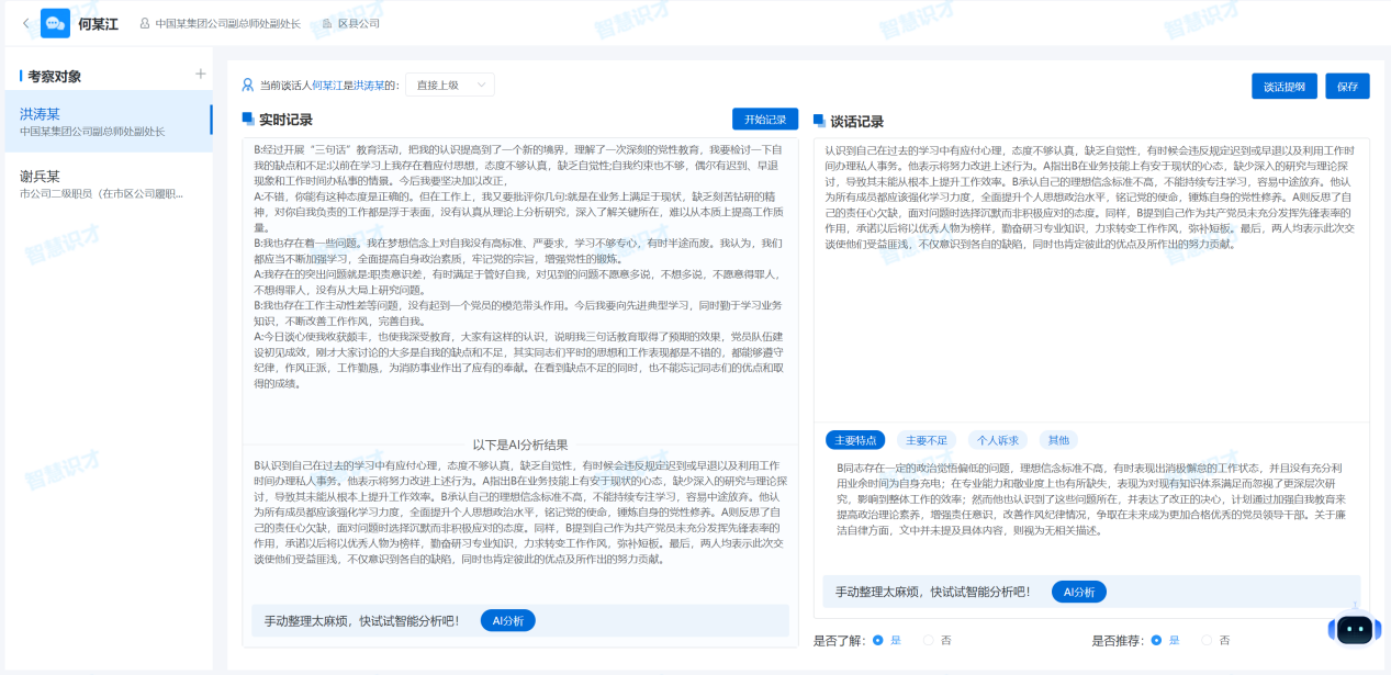 考察結束后,系統可匯總多個考察小組的談話記錄,通過大模型智能擴寫等人工智能技術,對談話人描述的“德能勤績廉”情況、推薦情況等信息,自動進行語義分析、整合提煉,為每位考察對象生成一份專屬的考察報告。